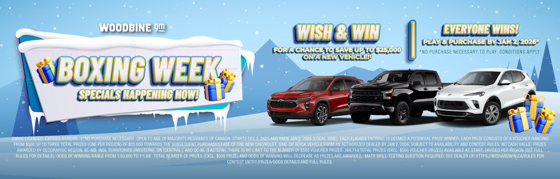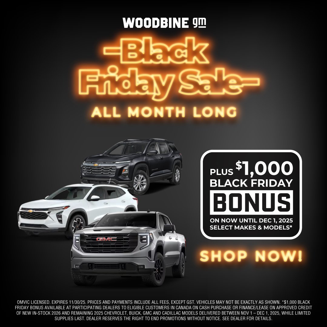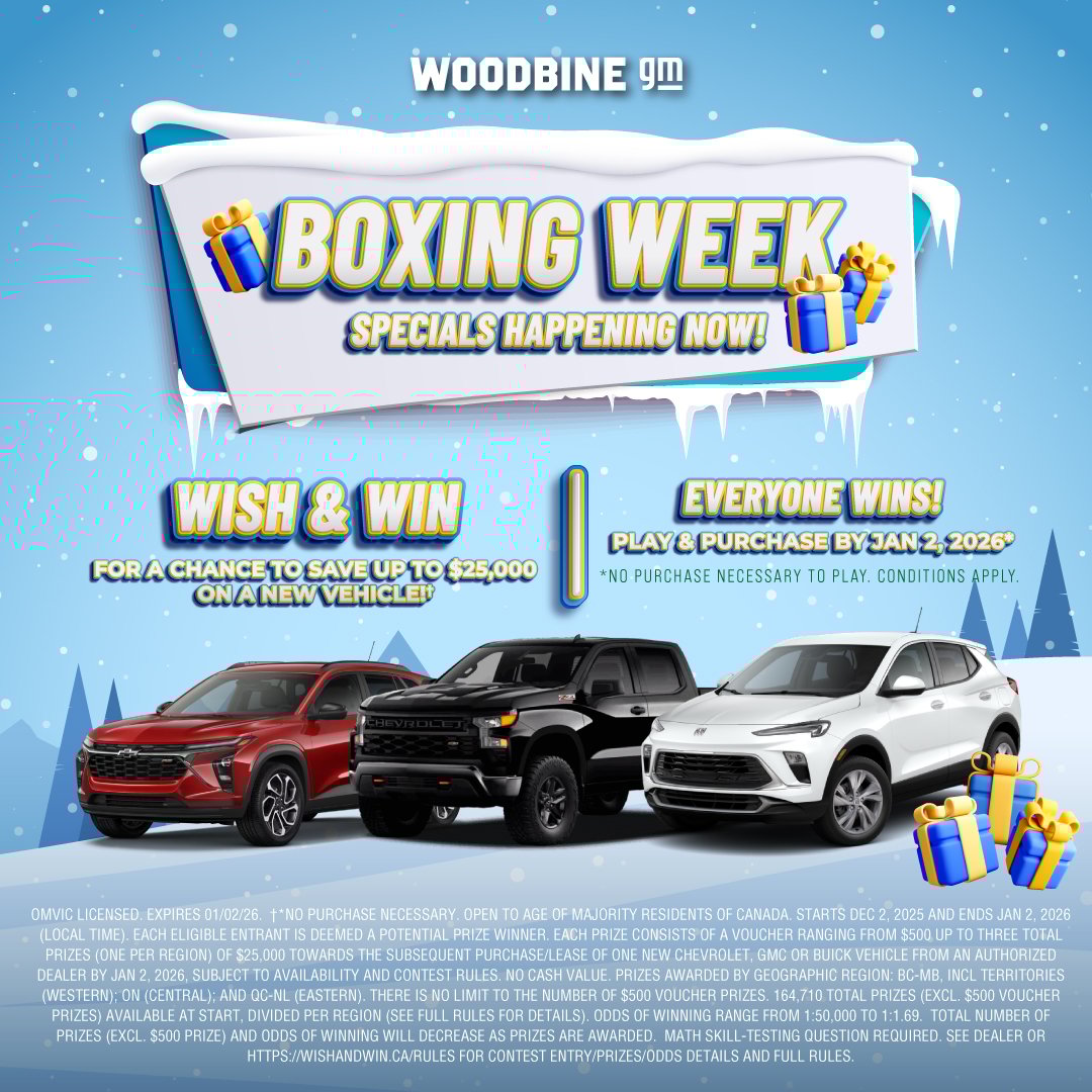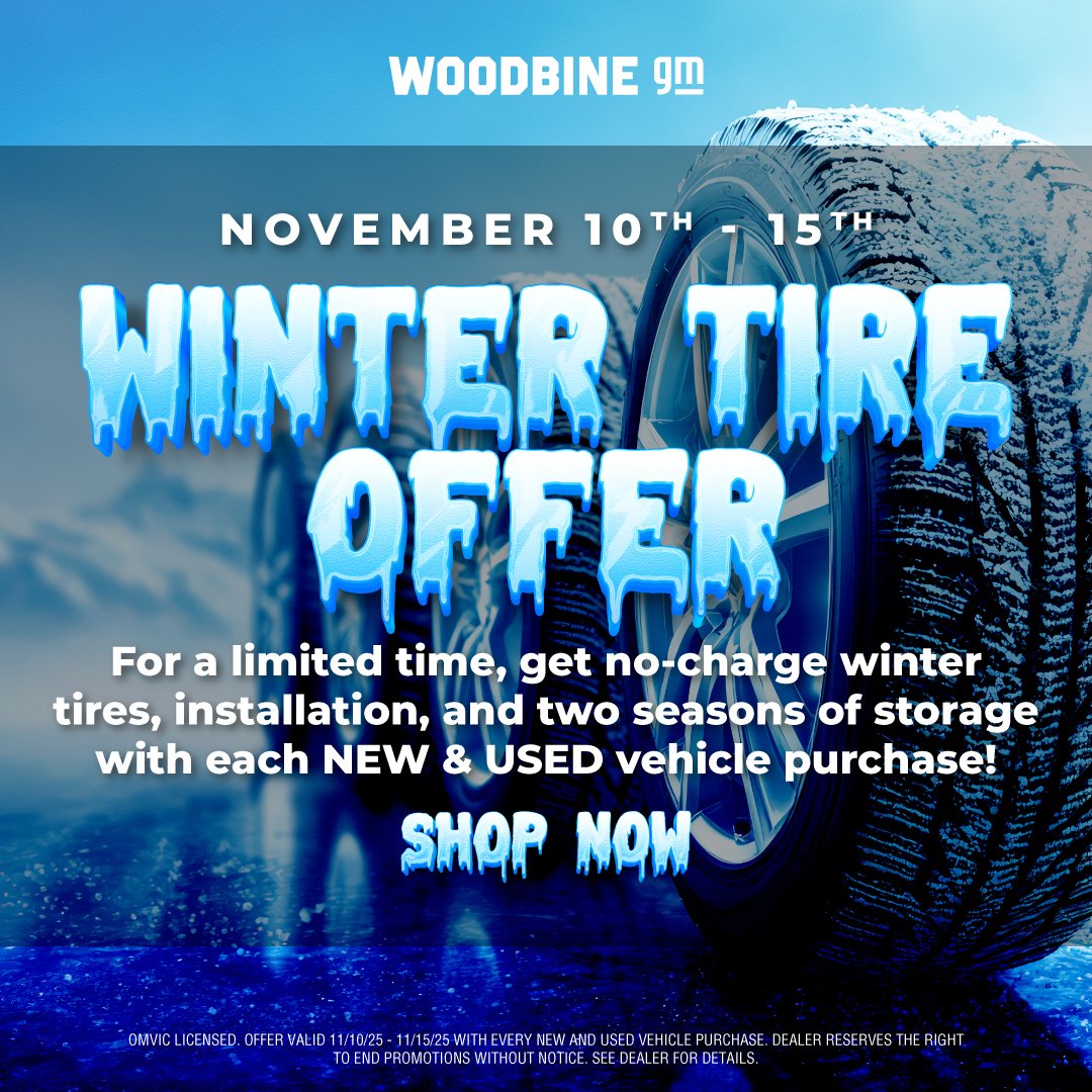 * $150 instant rebate on the purchase of a set (4 tires) of Bridgestone Blizzak winter tires when you purchase, finance or lease an eligible 2023-2026 GM vehicle between January 3, 2025 to December 31, 2025. New retail vehicles only; purchase, finance or lease of used, certified pre-owned or fleet vehicles not eligible for offer. Eligible tires must be purchased at time of delivery of vehicle. Rebate is non-stackable with other Bridgestone consumer offers. Rebate applied before applicable taxes. Offer is subject to tire availability. No rain checks available. This offer may be changed, cancelled or extended at any time without notice. Conditions apply. See participating dealer for details.n1 TIRE 30-DAY PRICE MATCH GUARANTEE: Your local dealer will match the competition's prices. If you purchase one of the aftermarket tire brands listed below and later find a better price on a qualifying brand within 30 days of the purchase, we’ll refund the difference. Tire Brands BFGOODRICH, BRIDGESTONE, CONTINENTAL, DUNLOP, FIRESTONE, GENERAL, GOODYEAR, HANKOOK, KELLY, MICHELIN, PIRELLI, UNIROYAL, KUMHO. The price match applies to the brands listed above. Competitive Prices: The competitive price you find must be in a valid ad, written estimate or Internet quote for identical, new tires. The tires must be an exact match in brand, tire line, size, load rating and speed rating to be eligible for the price match guarantee. All competitive quotes (including internet quotes) must come from a local competing tire retailer and installer (with a physical location within 100km of your participating GM retailer). The competitive price must be valid within 30 days of your purchase of any of the tire brands listed above. Service and Installation: The price match guarantee is only valid on the tire price and does not include installation/labour. Offer available to retail customers only at participating Canadian Chevrolet, Buick, GMC and Cadillac dealers. Offer valid from January 1, 2025 to December 31, 2025. GM Canada reserves the right to cancel, modify or amend the offer without notice. Conditions and limitations apply. May not be combined with other offers and programs.n